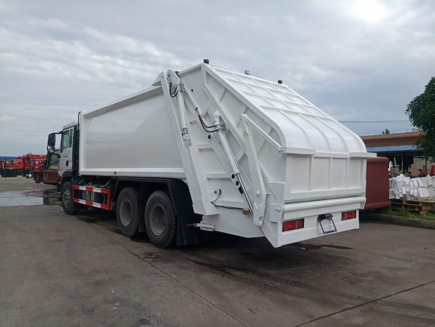 重汽汕德卡后雙橋壓縮式垃圾車:容積18-22立方。 濰柴270、350馬力,G5-M系列駕駛室,軸距:4300+1350,豪沃9檔變速箱,5.5噸前橋,11噸