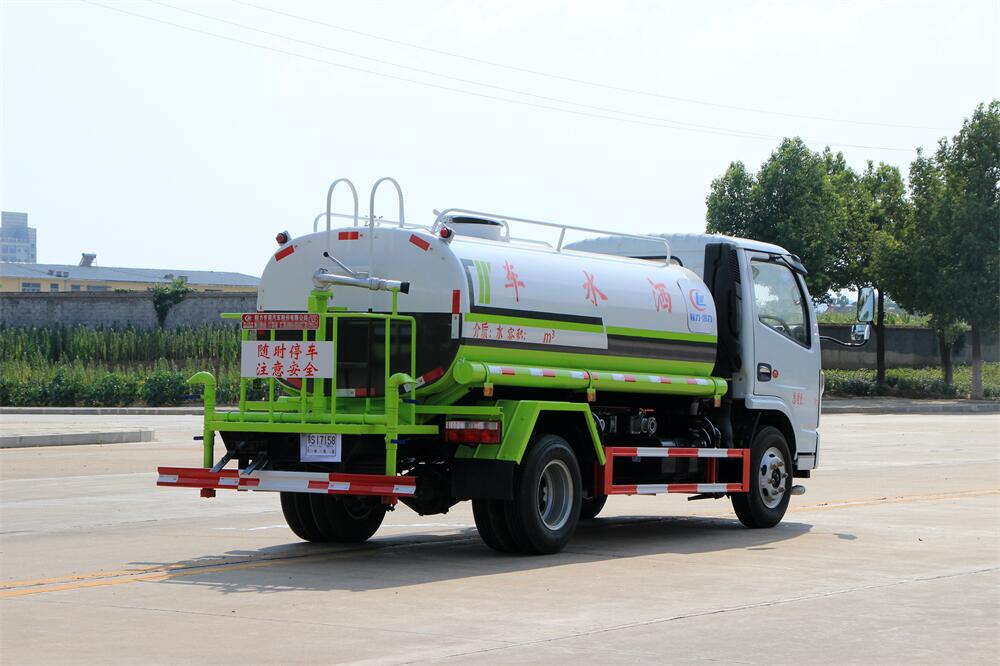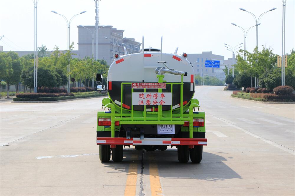 灑水車前裝有鴨形噴嘴或圓頭沖嘴,后面裝有圓柱開灑水噴嘴或蓮蓬頭噴嘴,后部有一工作平臺,裝配有水炮。后部還可裝8個噴嘴(選裝)。
