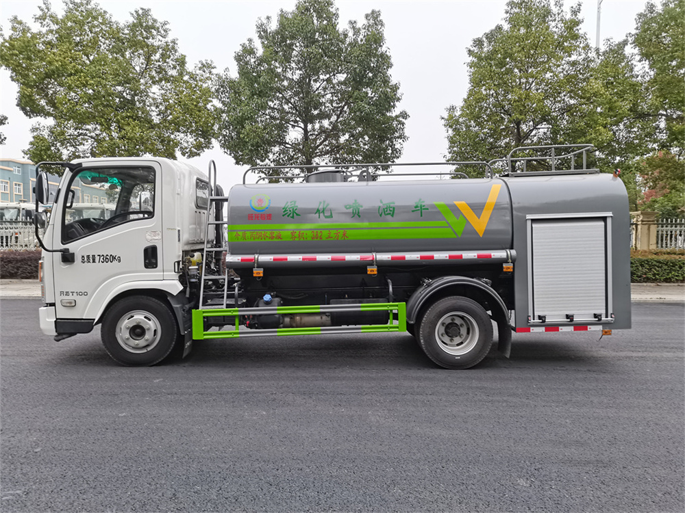 灑水車前裝有鴨形噴嘴或圓頭沖嘴,后面裝有圓柱開灑水噴嘴或蓮蓬頭噴嘴,后部有一工作平臺,裝配有水炮。后部還可裝8個噴嘴(選裝)。