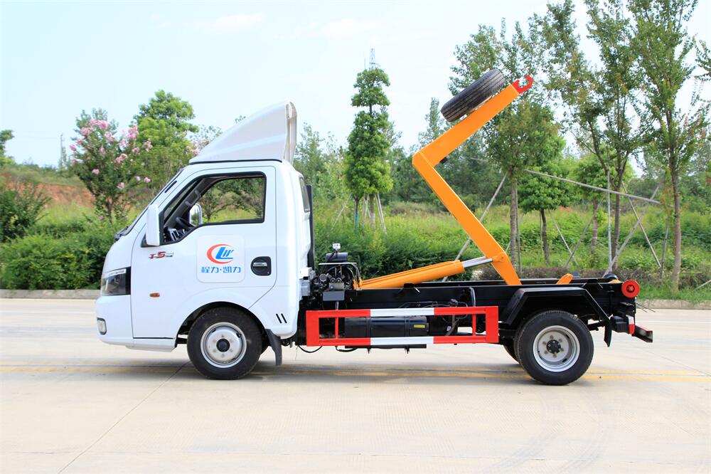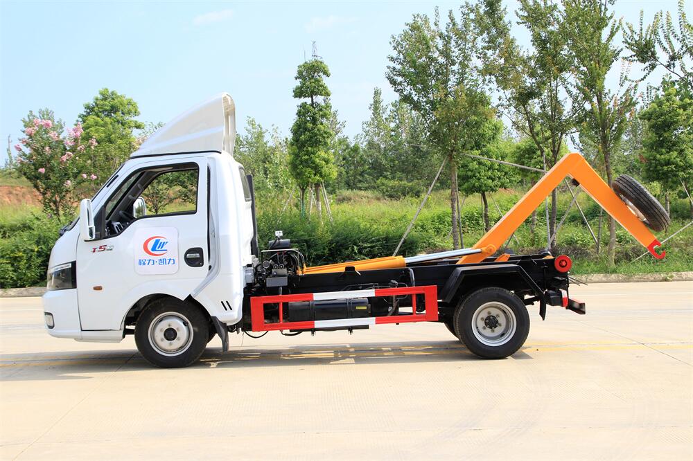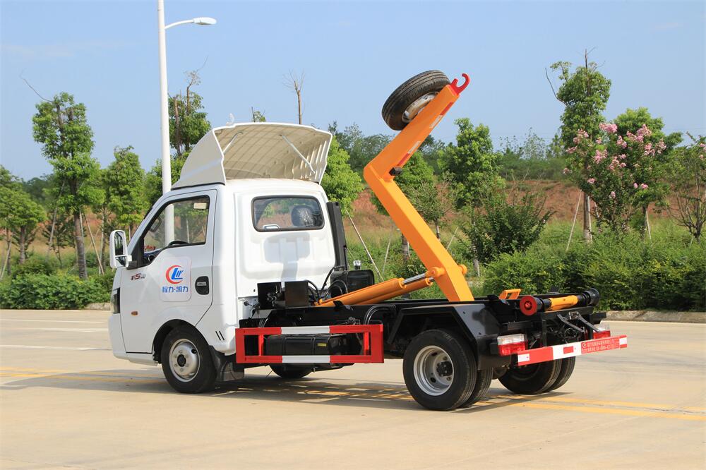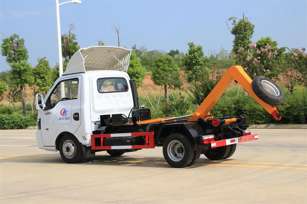 該款鉤臂式垃圾車由液壓系統、操作系統組成。舉升油制缸(1支)系國內知名液壓件廠家生產的雙作用油缸。垃圾廂可自吊上放下,可自行傾倒垃圾,上下一次工作循環(huán)時間≤50S。該車的特點是一個車能配多個垃圾廂,能實現一臺車與多個垃圾廂聯合作業(yè),循環(huán)運輸,充分提高了車輛的運輸能力。