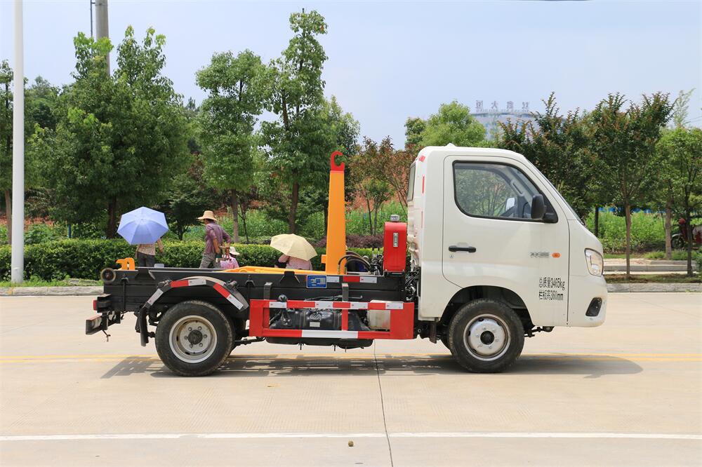 該款鉤臂式垃圾車由液壓系統、操作系統組成。舉升油制缸(1支)系國內知名液壓件廠家生產的雙作用油缸。垃圾廂可自吊上放下,可自行傾倒垃圾,上下一次工作循環時間≤50S。該車的特點是一個車能配多個垃圾廂,能實現一臺車與多個垃圾廂聯合作業,循環運輸,充分提高了車輛的運輸能力。