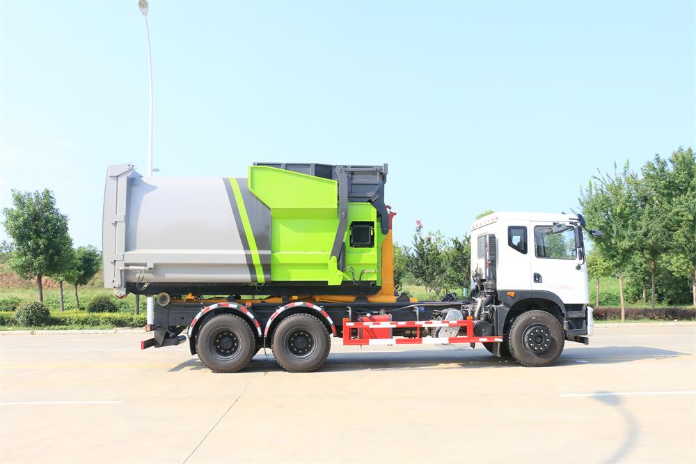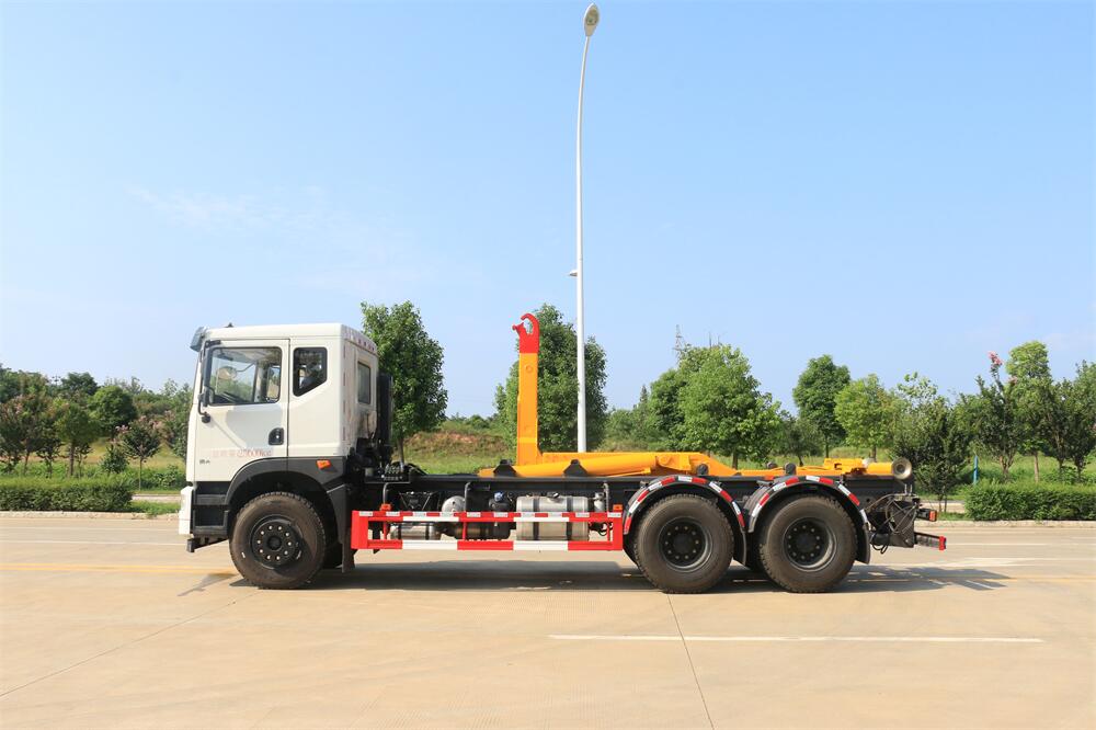 該款鉤臂式垃圾車由液壓系統、操作系統組成。舉升油制缸(1支)系國內知名液壓件廠家生產的雙作用油缸。垃圾廂可自吊上放下,可自行傾倒垃圾,上下一次工作循環時間≤50S。該車的特點是一個車能配多個垃圾廂,能實現一臺車與多個垃圾廂聯合作業,循環運輸,充分提高了車輛的運輸能力。