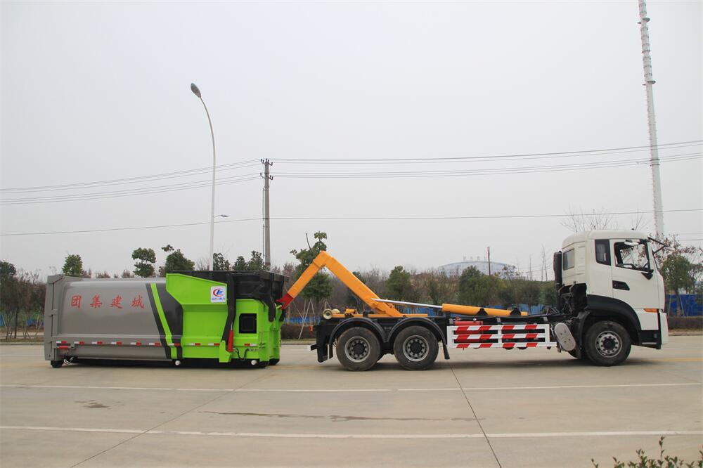勾臂式垃圾車(chē)(車(chē)廂可卸式垃圾車(chē))介紹: 車(chē)廂可卸式垃圾車(chē)又叫拉臂式垃圾車(chē),是一種采用高新設(shè)計(jì)可伸縮的鉤臂,實(shí)現(xiàn)垃圾廂的二次吊裝,自吊上放下,可自行傾倒垃圾的環(huán)衛(wèi)設(shè)備。 拉臂式垃圾車(chē)結(jié)構(gòu)簡(jiǎn)單,操作穩(wěn)定方便,裝卸效率高,機(jī)械化程度高,節(jié)省人力。鉤臂垃圾車(chē)一車(chē)可帶多個(gè)垃圾廂,在裝卸的運(yùn)輸過(guò)程中可有效地避免二次污染。 拉臂垃圾車(chē)采用高新設(shè)計(jì)可擺動(dòng)的鉤臂,垃圾箱由框架、開(kāi)啟油缸、滑輪、后門(mén)和若干加強(qiáng)框架與鋼板焊接而成。調(diào)換貨廂快捷方便,貨廂上帶蓋(倒垃圾時(shí)可翻開(kāi)),鉤臂垃圾車(chē)?yán)鴰w可選用碳鋼、不銹鋼材質(zhì)、內(nèi)部采取環(huán)氧樹(shù)脂防腐處理,改裝部分與原車(chē)底盤(pán)為可分離式,維修方便且保持了原車(chē)的機(jī)動(dòng)性及行駛性能。