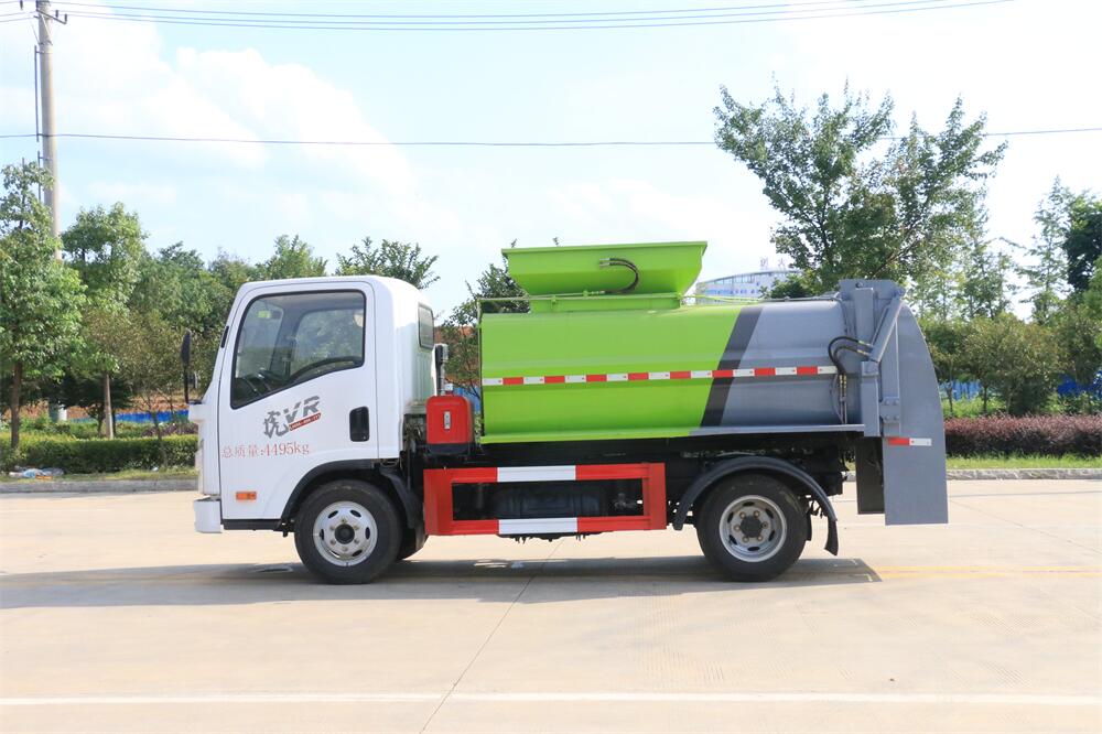 上裝配置:罐體容積6m3,配備120L/240L掛桶提升翻轉機構,液壓系統,后蓋液壓鎖緊開啟,罐體可以舉升自卸,尾部帶自流閥;用于運輸液態垃圾,其特點操作簡單,密封性好,無泄漏,無異味;可選裝固液分離功能,推板擠壓功能,常用于餐館的垃圾轉運處理。