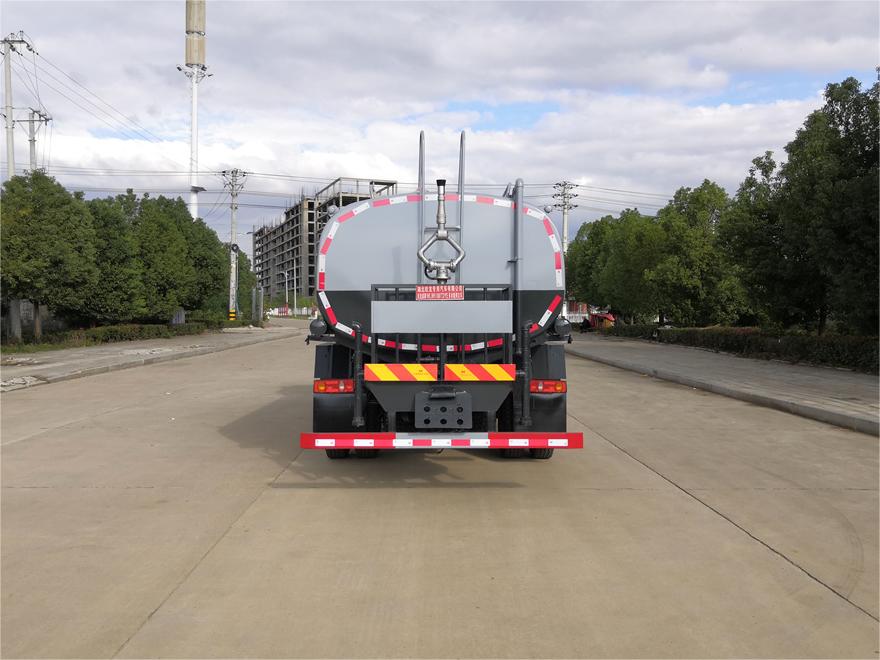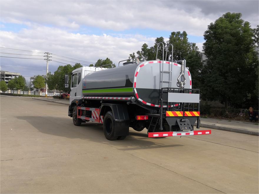 灑水車(chē)前裝有鴨形噴嘴或圓頭沖嘴,后面裝有圓柱開(kāi)灑水噴嘴或蓮蓬頭噴嘴,后部有一工作平臺(tái),裝配有水炮。后部還可裝8個(gè)噴嘴(選裝)。