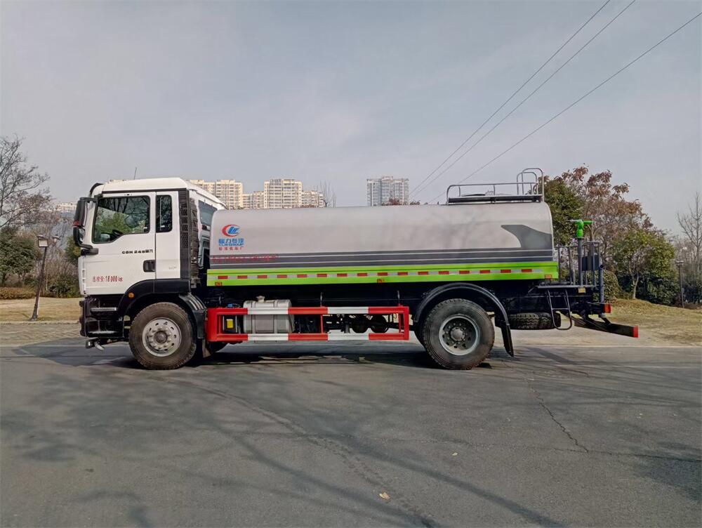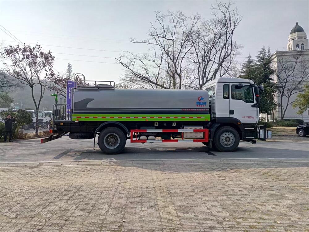 灑水車前裝有鴨形噴嘴或圓頭沖嘴,后面裝有圓柱開灑水噴嘴或蓮蓬頭噴嘴,后部有一工作平臺,裝配有水炮。后部還可裝8個噴嘴(選裝)。