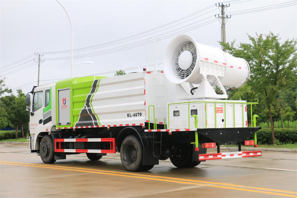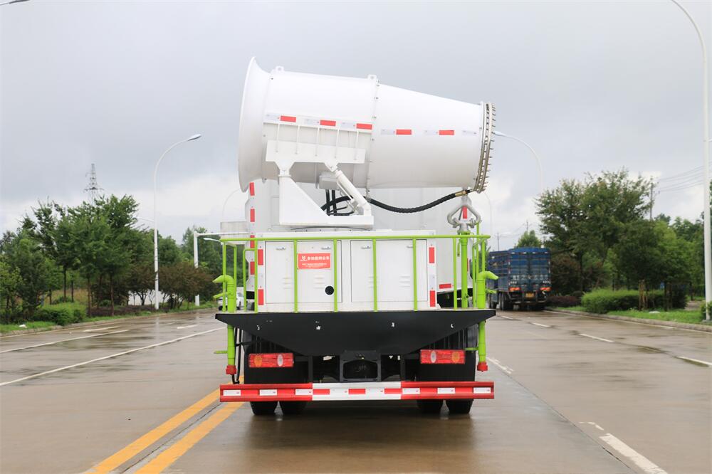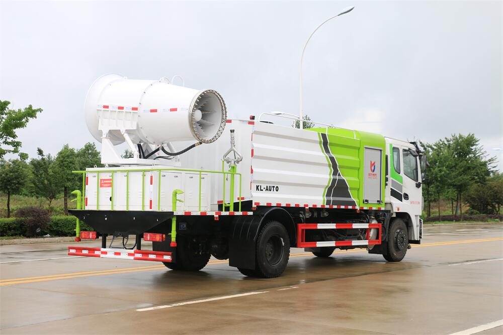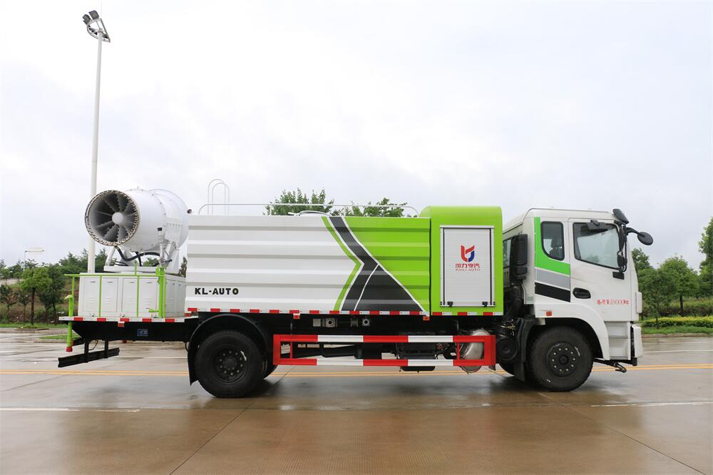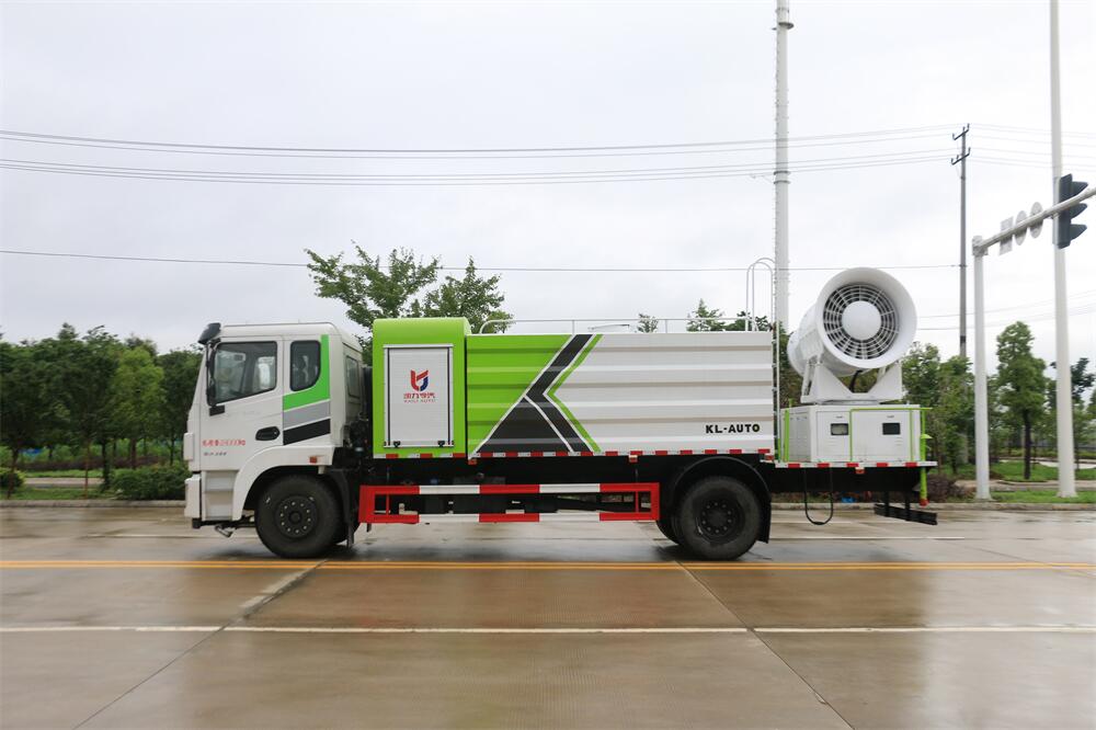 上裝配置:罐體容積為 12立方,選配風送式霧炮機組射程30米、40米、50米、60米、80米、100米、120米霧炮,罐體鋼板為4mm碳鋼Q235材質,罐內隔板具有防波作用,以減輕汽車行駛時罐體液體沖擊,罐體及整車外形尺寸按照公告。帶大功率專用灑水泵,泵可自吸自排,整車前沖、后灑、側噴、帶65消防接口,后平臺配CLW-50、CLW-60、CLW-80、CLW-100、CLW-120型風送式霧炮機組;罐體前封頭配大功率柴油發(fā)電機組;前封頭帶水位計,后平臺主管路帶1寸澆花接口,后爬梯。帶兩根輸水管及陰陽端。罐體顏色:銀/灰/綠,罐體兩側噴“多功能抑塵車”字樣,貼反光標示。