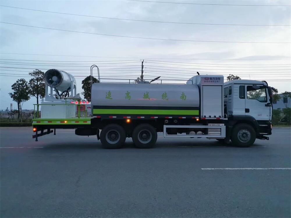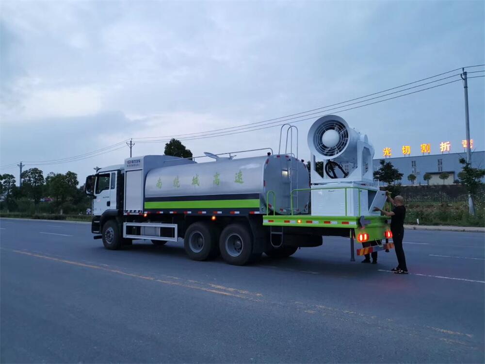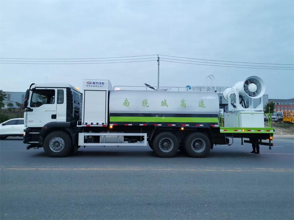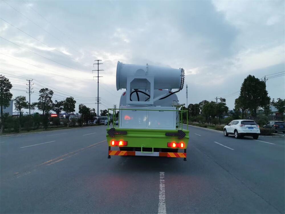 上裝配置:罐體容積為 16立方,選配風送式霧炮機組射程30米、40米、50米、60米、80米、100米、120米霧炮,罐體鋼板為4mm碳鋼Q235材質,罐內隔板具有防波作用,以減輕汽車行駛時罐體液體沖擊,罐體及整車外形尺寸按照公告。帶大功率專用灑水泵,泵可自吸自排,整車前沖、后灑、側噴、帶65消防接口,后平臺配CLW-50、CLW-60、CLW-80、CLW-100、CLW-120型風送式霧炮機組;罐體前封頭配大功率柴油發電機組;前封頭帶水位計,后平臺主管路帶1寸澆花接口,后爬梯。帶兩根輸水管及陰陽端。罐體顏色:銀/灰/綠,罐體兩側噴“多功能抑塵車”字樣,貼反光標示。