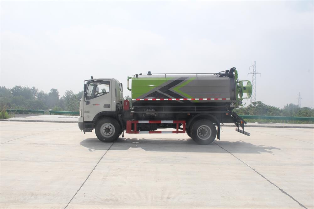 上裝配置:上裝配置:水罐4 立方,污罐 8立方;清洗 部份采用天津通潔,壓力 24Mpa,流量 215L/min,配80米直徑22高壓管帶液壓卷盤; 吸污部份采用山東 SK-15 水循環泵(億豐 10T 雙聯想真空泵),吸污罐帶舉升,后蓋液壓開 啟,帶一個 600mm 快開,罐體后尾部一個 DN150 排污口球閥,一個 DN100 進污口球閥,一個視 污窗,一根 10m 吸污管,一套陰陽端,壓力 表,防溢閥,箭頭燈,淋管裝置,高壓泵帶氣 吹水。配一個 4.5 公斤水雷噴頭,另帶一個 80 公分手持洗車噴頭。